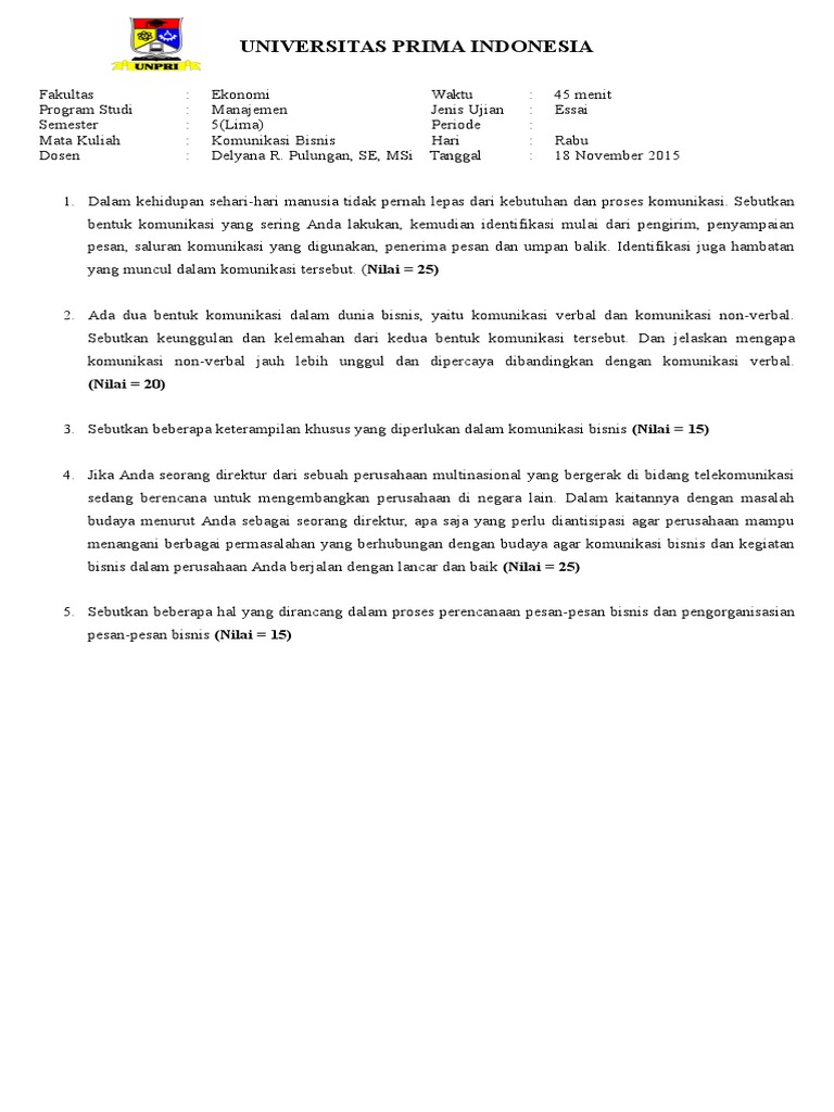 Soal Ujian Komunikasi Bisnis Uas Doc