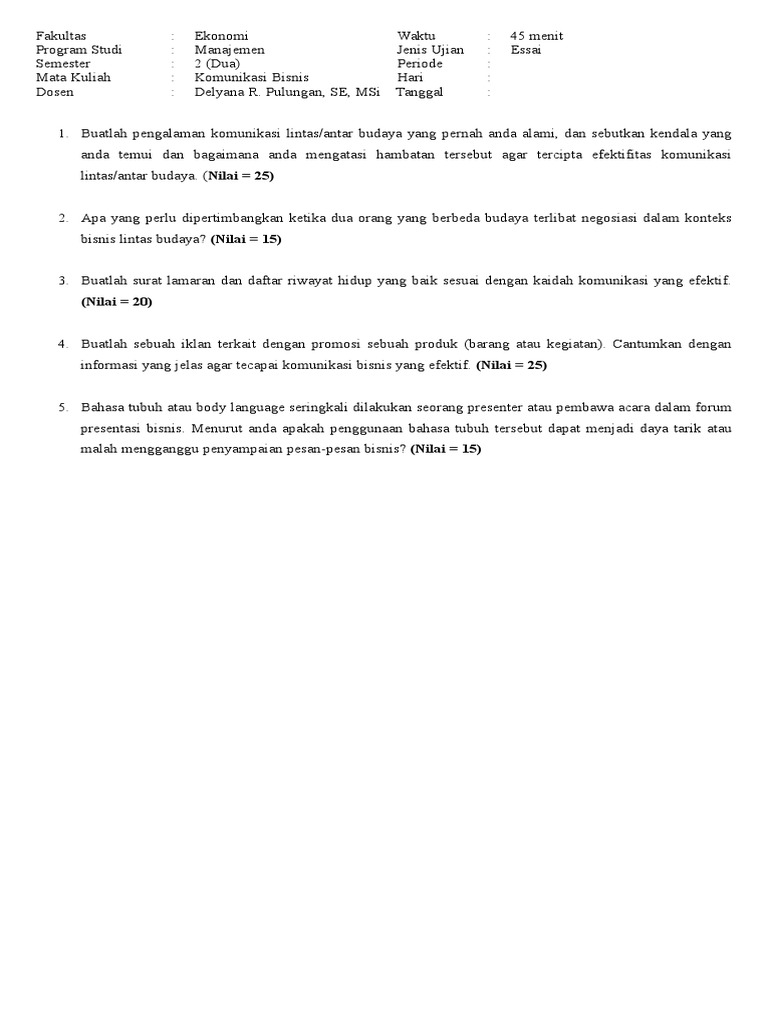 20210312 Contoh soal yang disajikan dalam bentuk pilihan ganda dan essay. Membuat kebijakan dan aturan teknis c. Soal Uas Komunikasi Bisnis Semester 5 Oleh admin Diposting pada 17 Juli 2020 Soal Dan Jawaban Komunikasi Lintas Budaya Gedung Ge Download 17 Template Word Untuk Sampul Laporan Cover Page Soal Dan Jawaban.