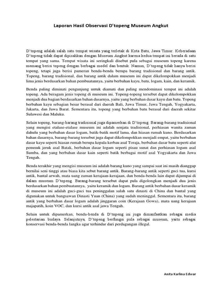 Berdasarkan hasil wawancara dengan 20 orang guru di Kabupaten Grobogan diperoleh data sebagai berikut 1 65 guru tahu akan keberadaan museum dan pernah kesana 2 30 guru. Museum ini dibangun dengan dana yang terkumpul dari masyarakat. D TOPENG MUSIUM ANGKUT Contoh Laporan Hasil Observasi Dtopeng Museum Angkut Dtopeng adalah salah satu tempat wisata yang terletak di Kota Batu Jawa Timur.
