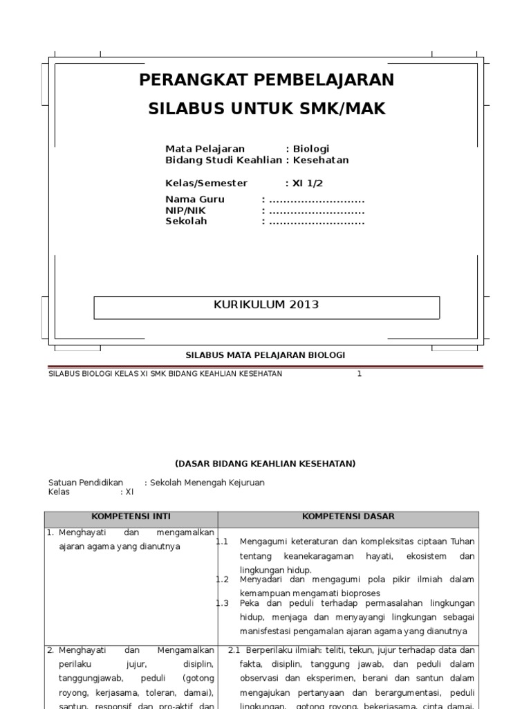 Download View Silabus Biologi Smk Kesehatan Kelas X Xi as PDF for free. Peranan Biologi di bidang kesehatan. Silabus KI dan KD SMK Bidang Keahlian Kesehatan dan Pekerjaan Sosial K13 Revisi 2017 yang akan BapakIbu download ini mudah-mudahan sesuai dengan harapannya dalam menlengkapi perangkat administrasi Guru SMK secara lengkap.