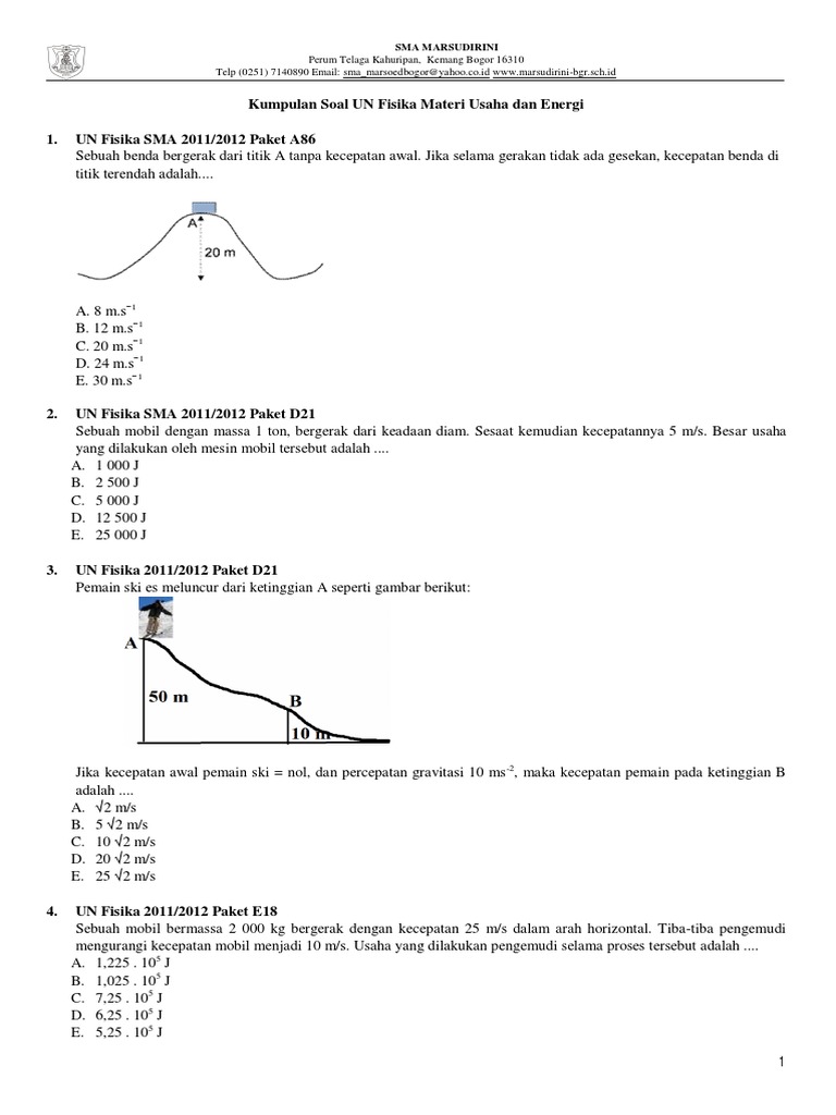 W usaha J Δ Ek perubahan energi kinetik J m massa benda kg v kecepatan akhir benda ms. Email protected wwwmarsudirini-bgrschid Kumpulan Soal UN Fisika Materi Usaha dan Energi 1. SMA MARSUDIRINI Perum Telaga Kahuripan Kemang Bogor 16310 Telp 0251 7140890 Email.