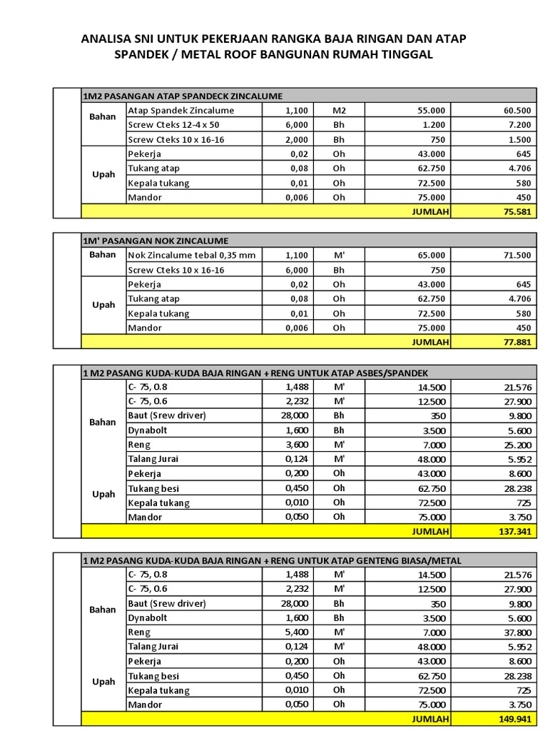 There was a problem previewing ANALISA SNI 2010 UNTK RANGKA BAJA RINGAN DAN ATAPpdf. ANALISA SNI UNTUK PEKERJAAN RANGKA BAJA RINGAN DAN ATAP SPANDEK METAL ROOF BANGUNAN RUMAH TINGGAL 1M2 PASANGAN ATAP SPANDECK ZINCALUME Atap Spandek Zincalume 1100 Bahan Screw Cteks 12-4 x 50 6000 Screw Cteks 10 x 16-16 2000 Pekerja 002 Tukang atap 008 Upah Kepala tukang 001 Mandor 0006. Silakan hubungi 0821-7824-2523 untuk jasa pemasangan atap spandek.