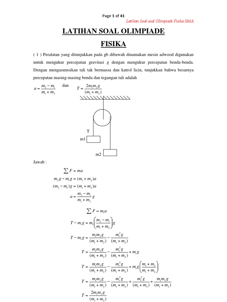 Sebenarnya soal-soal olimpiade fisika sudah banyak yang menjual di toko buku tapi kebetulan saya punya contoh soal yang bisa dibagikan di sini hehehe. Penekanan soal Olimpiade matematika bukan lagi soal rutin namun lebih kepada aspek penalaran pemecahan masalah dan komunikasi dalam matematika. Idealnya Anda akan menggambar diagram gaya free body diagram tetapi hanya dengan membayangkan penggambaran soal di dalam kepala misalnya berupa grafik akan sangat membantu menyelesaikan soal dengan lebih mudahTerkadang guru memberikan nilai ekstra karena sudah.