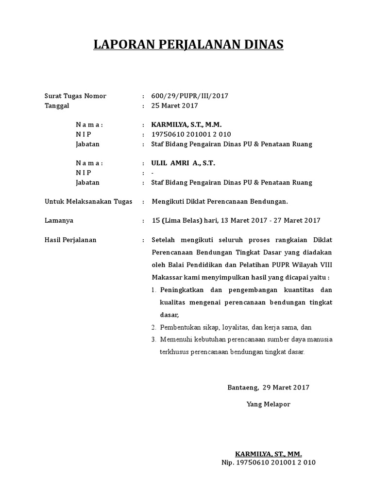 LAPORAN HASIL PERJALANAN DINAS. Pada prinsipnya setiap pegawaipelaksana perjalanan dinas diwajibkan untuk membuat laporan pertanggungjawaban perjalanan dinas. Contoh Laporan Perjalanan Dinas Selain sesuai dengan format yang telah disebutkan sebelumnya terdapat beberapa format laporan dinas lain.