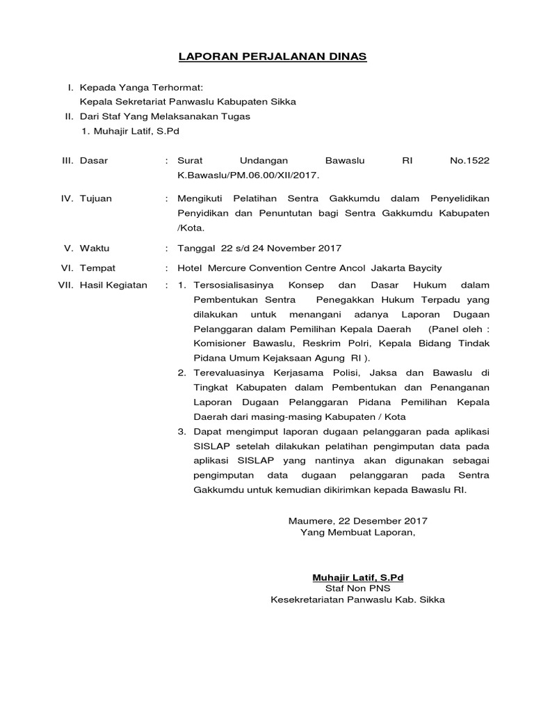 LAPORAN HASIL PERJALANAN DINAS Author. Contoh Surat Laporan Perjalanan Dinas Sppd Yang Benar Contoh Surat Surat Perintah Perjalanan Dinas 17 Contoh Surat Keterangan Biasa Dinas Kerja Kuliah Kpr Inilah Lampiran Spj Perjalanan Dinas Lengkap Abdi Desa Contoh Laporan Hasil Perjalanan Dinas Laporan Perjalanan Dinas Batam Sitti Rachmawaty Academia Edu. Laporan Perjalanan Dinas adalah laporan yang wajib dibuat oleh pelaksana perjalanan dinas setelah selesai melaksanakan kegiatan perjalanan dinas.