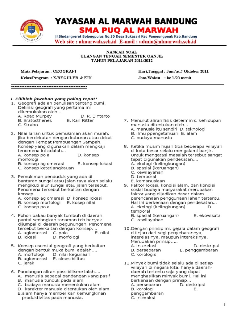 Tulis namamu di sudut kanan atas 2. Contoh soal uts geografi kelas 10 Berikut ini adalah file tentang contoh soal uts geografi kelas 10 yang bisa bapakibu unduh secara gratis dengan menekan tombol download pada tautan link di bawah ini. Halo kawan-kawan guru pekan mid term atau penilaian tengah semester sebentar lagi bergulir.