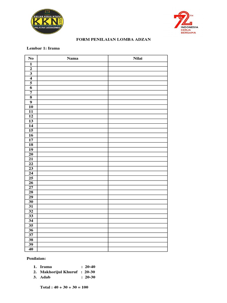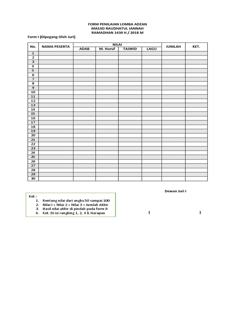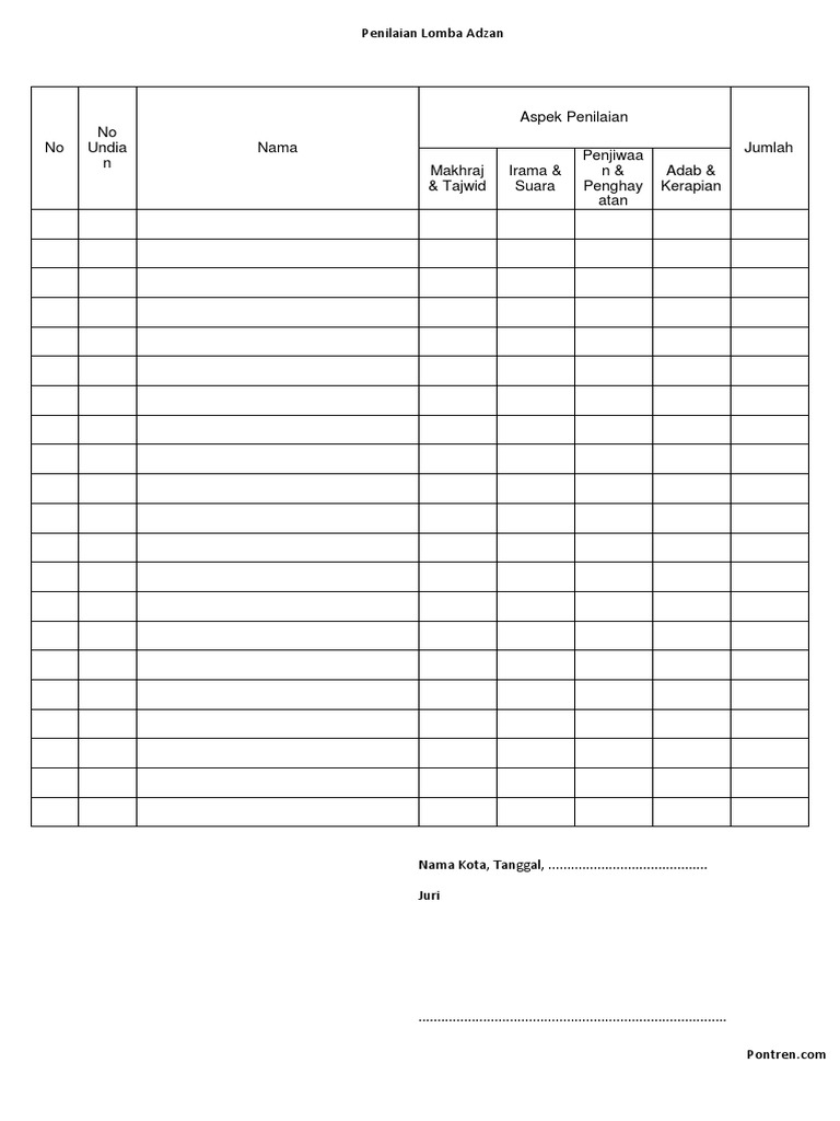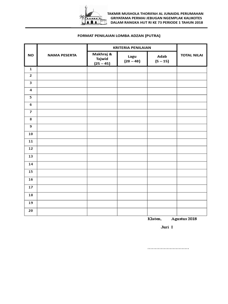 Form Penilaian Lomba Adzan - Free download as Word Doc doc docx PDF File pdf Text File txt or read online for free. 100 menganggap dokumen ini bermanfaat Tandai dokumen ini sebagai bermanfaat. FORMAT PENILAIAN LOMBA ADZAN dan IQAMAHKet TKATPA AN-NAAJIYAH UNIT 277 BUMI ANTANG PERMAI KELAS TADARRUS dan TAKHASHUS No Nama Santri Kelas Kriteria penilaian Makhraj Tajwid 45 Lagu 40 Adab 15 Jumlah 100.