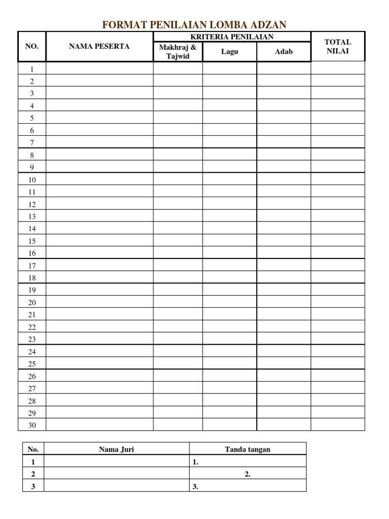 Format Penilaian Lomba Tilawah untuk kalangan umum Dan yang model terakhir yaitu berbentuk sederhana yang hanya memuat pokok bidang penilaian lomba berupa bidang lagu suara tajwid dan adab tanpa adanya perincian detail dari keempat bidang perlombaan yang dinilai. Download blangko form penilaian lomba adzan dan iqomah dalam bentuk format doc. Nada dan irama bebas sesuai keinginan peserta lomba.