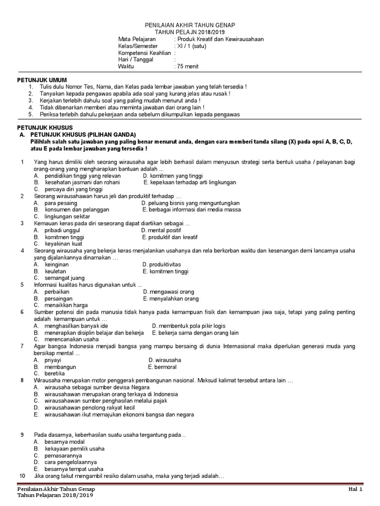 Soal Pat Produk Kreatif Kewirausahan Pdf