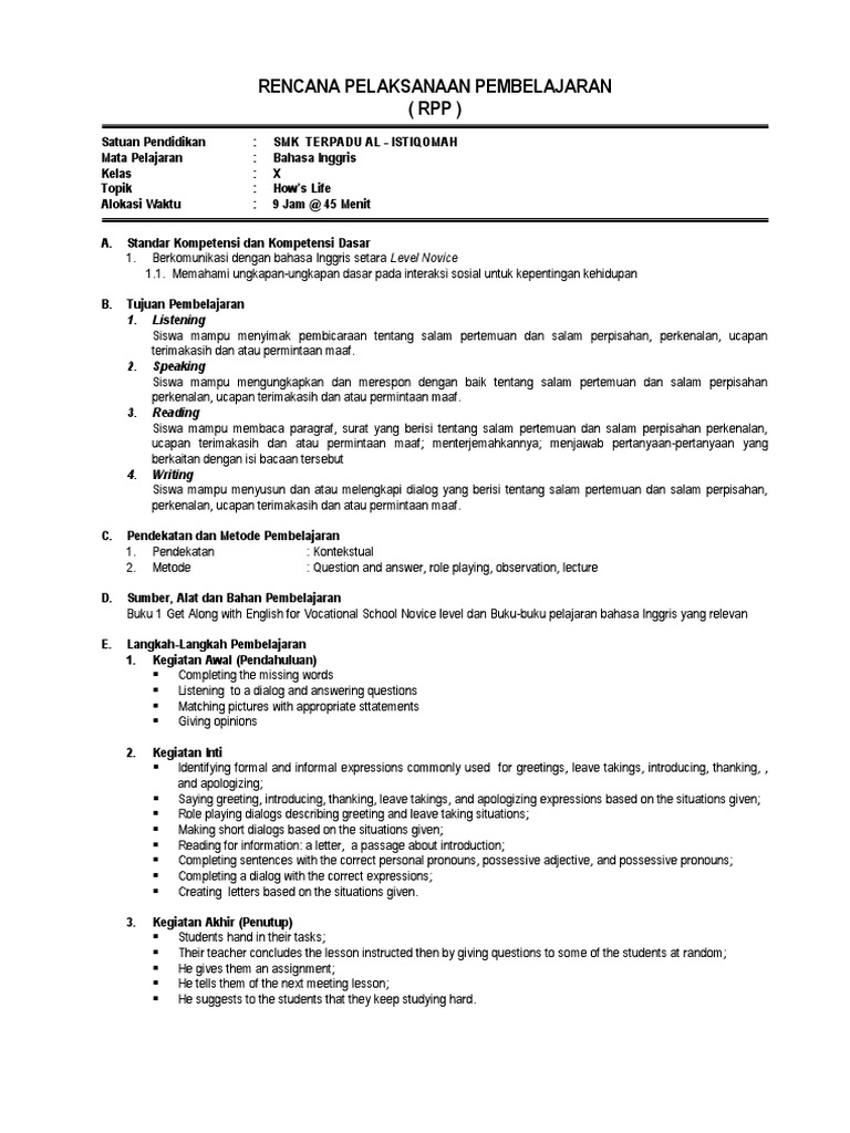 RPP Bahasa Inggris KTSP untuk SMP Kelas 7 8 dan 9 - Hi para jagoan bahasa inggris hows life. SM P Mata Pelajaran.