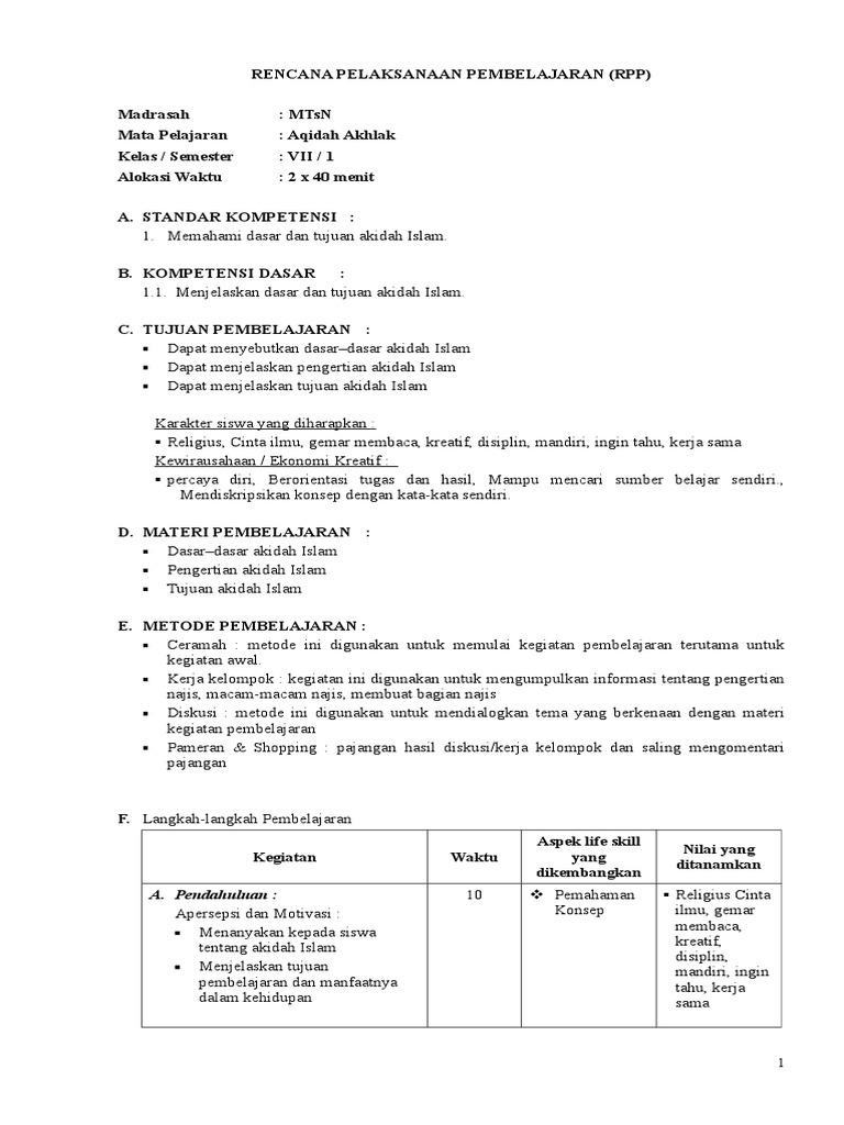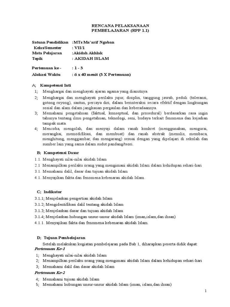 Rpp Kurikulum 2013 Aqidah Akhlak Mts Kelas Vii Semester 1