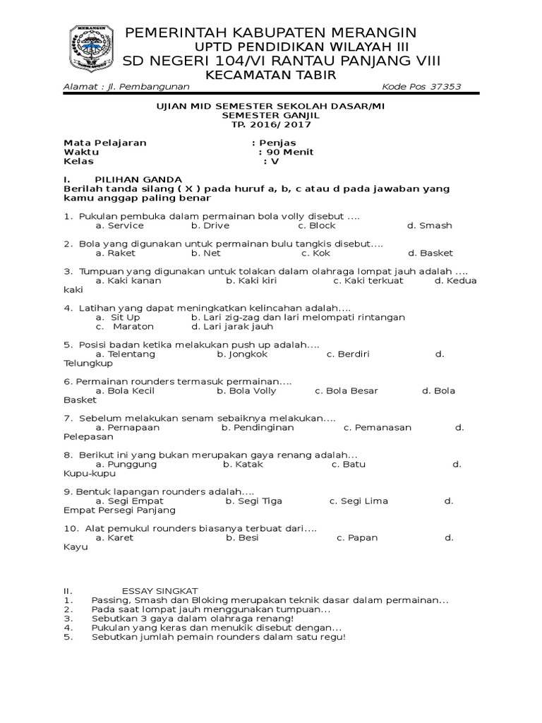 Soal Ujian Mid Semester Genap Penjaskes Kelas 5 Sd