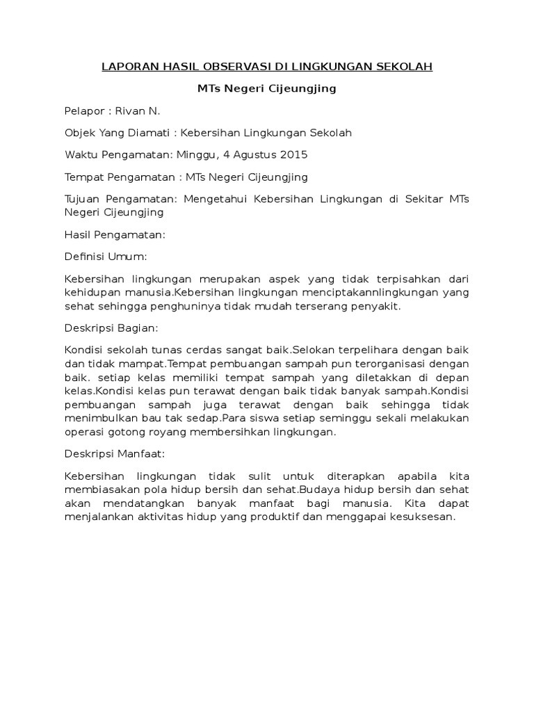 Ketahui perkembangan suatu masalah. Membuat contoh laporan hasil observasi lingkungan sekolah pun tidak jauh berbeda dengan laporan observasi yang lainnya. CONTOH TEKS LAPORAN HASIL OBSERVASI LINGKUNGAN SEKOLAH.